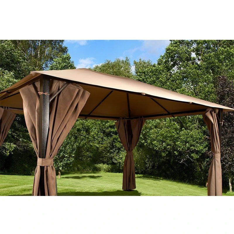 Not only as tough as they come, this garden awning is beautiful too, for the stunning pyramid-shaped roof, complementary curtains with ties, and contrasting shades of brown to the fabric and frame make it one of the most attractive garden canopies on the market and a real standout garden centrepiece.