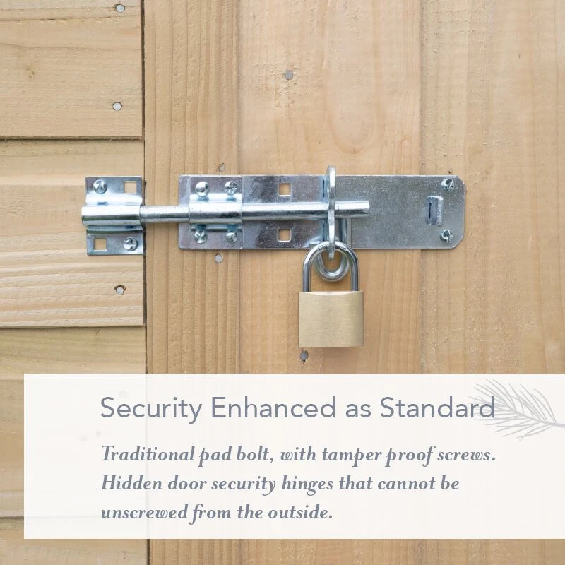 You can access this shed via wide double doors, which can be installed in different positions to suit the orientation of your garden. Ledged and braced for extra strength and to prevent dropping/ movement, these doors are fitted with hidden security hinges and a pad bolt to give you peace of mind that your valuable tools are safe (padlock not included).