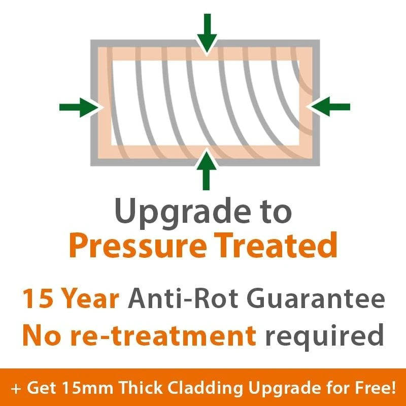 - Upgrade to pressure-treated wood for a 15-year guarantee and FREE 15mm cladding upgrade