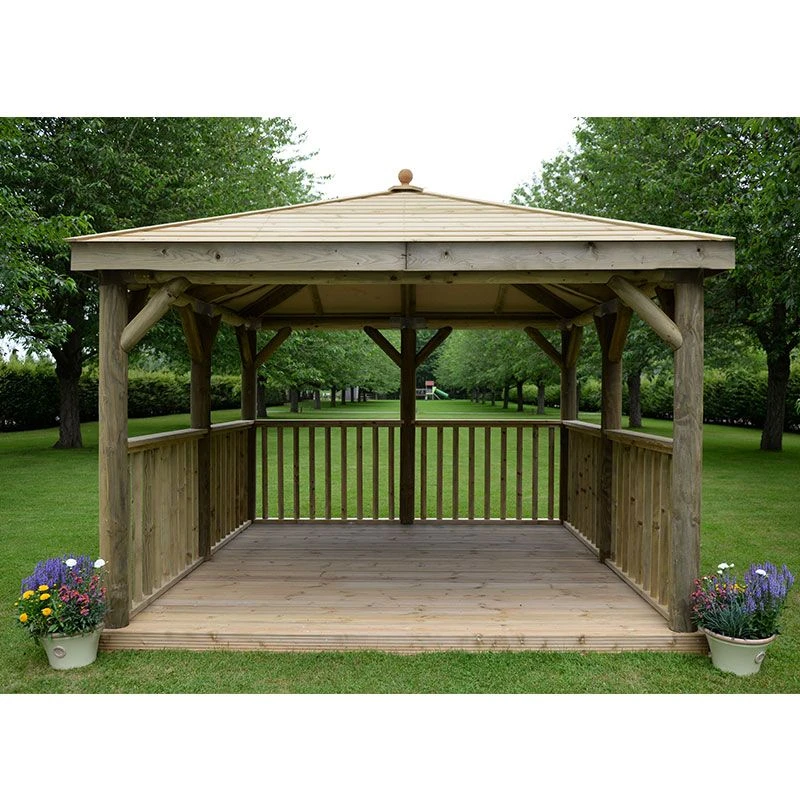 This superior gazebo has dimensions of 3140mm x 3670mm x 3670mm and is also available with a New England cedar roof, as well as without a base. Installation is included in the price and free delivery is available to most UK addresses.