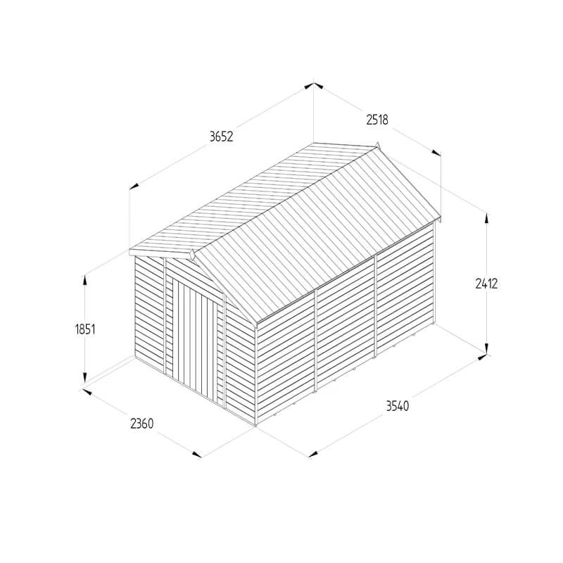 Forest is Britain’s leading manufacturer of wooden sheds and Timberdale is their premier line. It should be your go-to range of sheds when only the best will do. Beautifully handcrafted in the heart of Worcestershire and supplied with a market-leading 25-year anti-rot guarantee, this 12×8 Timberdale Windowless Apex Shed (3.65m x 2.52m) makes an excellent choice if you require secure, general-purpose, large garden storage.