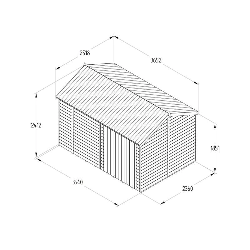 Forest is Britain’s leading manufacturer of wooden sheds and Timberdale is their premier line. It should be your go-to range of sheds when only the best will do. Beautifully handcrafted in the heart of Worcestershire and supplied with a market-leading 25-year anti-rot guarantee, this 12×8 Timberdale Windowless Double Door Reverse Apex Shed (3.65m x 2.52m) makes an excellent choice if you require large, secure, top-quality outdoor storage.