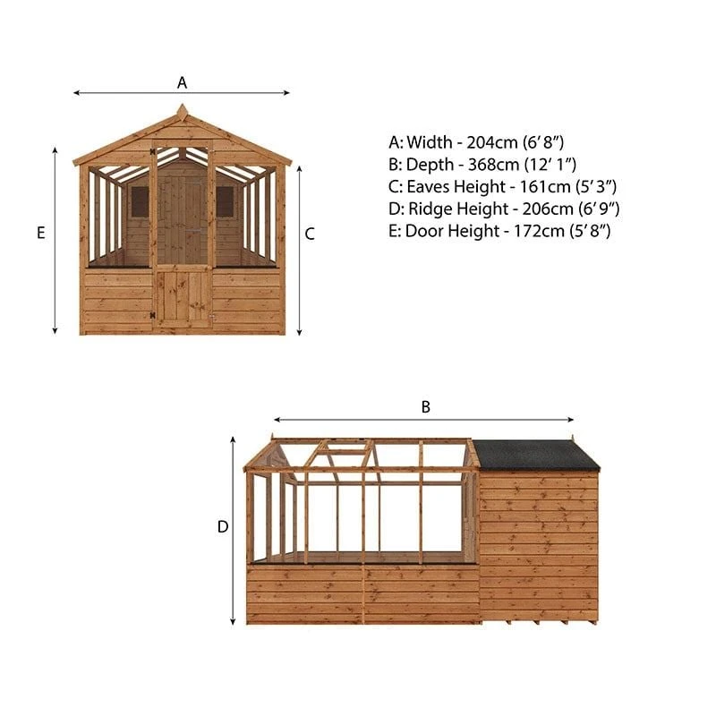 With dimensions of 2039mm x 1972mm x 3615mm, this wooden shed and small greenhouse are supplied dip-treated; it should be re-treated within 6 weeks of assembly and annually thereafter, in order to maintain their handsome appearance and validate the impressive 10 year anti-rot guarantee.