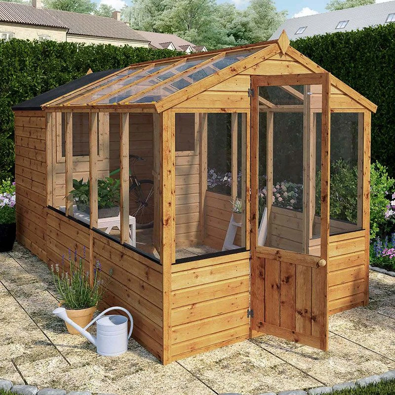 A charming 12×6 potting shed, this wooden greenhouse and shed combination enables you to enjoy growing your own veg or plants while stowing your garden tools, compost, etc out of sight.