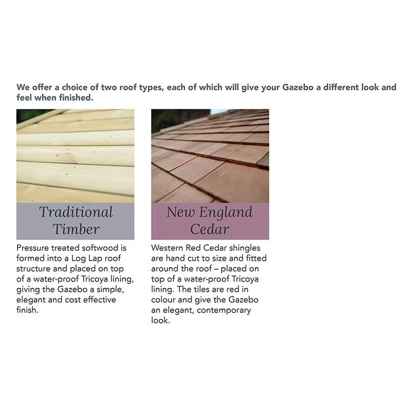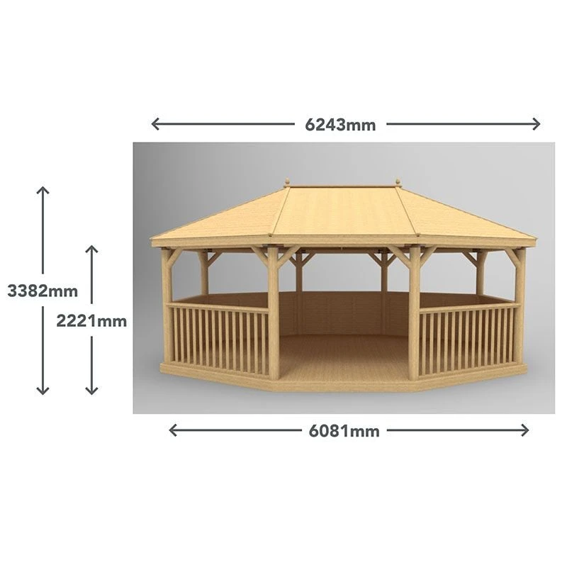With dimensions of 338cm x 624cm x 486cm, this glorious garden gazebo is also available sized 5.1m and with a choice of either a cedar or timber roof.