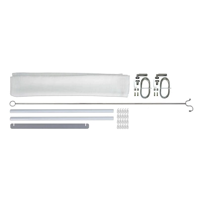 This patio awning blind set includes the following: 1 x shade curtain 290cm x 54cm, 1 x white 2-piece metal bar 19mm x 60cm for each curtain unit, 20 x plastic hooks, 2 x stretcher kits for the curtain cable and 1 x PVC-coated metal cable 320cm x 2mm. We also supply the mounting hardware.