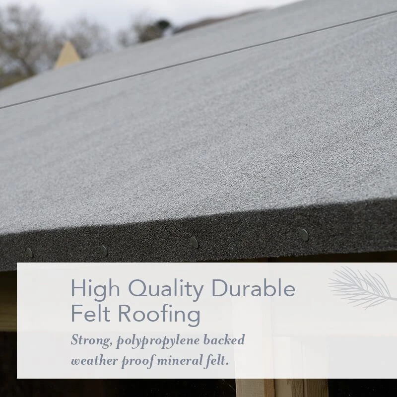 The roof is built from tough 8mm OSB and fitted with a green mineral-felt cover for complete weatherproof protection. It comes with a traditional apex design, barge boards and eye-catching finials. The wood’s smooth-planed finish perfectly rounds off the shed’s timelessly attractive appearance.