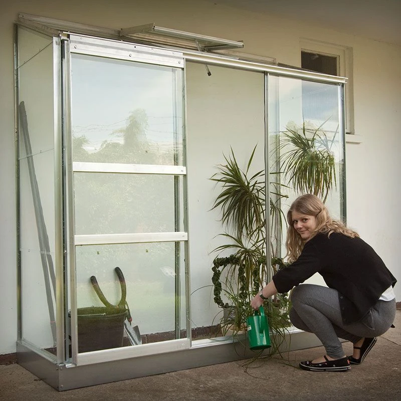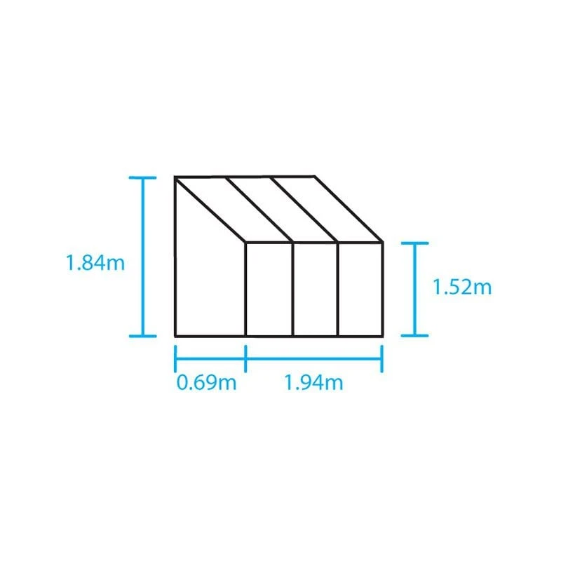 Robust, durable and rust-resistant, the aluminium frame is guaranteed for 12 years. All our Wall Gardens from Halls have a front height of 1.53m, a ridge height of 1.82m and a depth of 0.69m. This 6×2 greenhouse is 1.94m wide and provides you with a base area of 1.34m2.