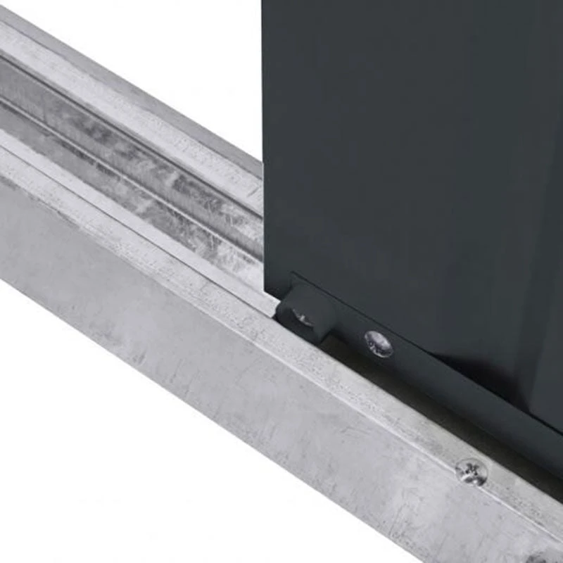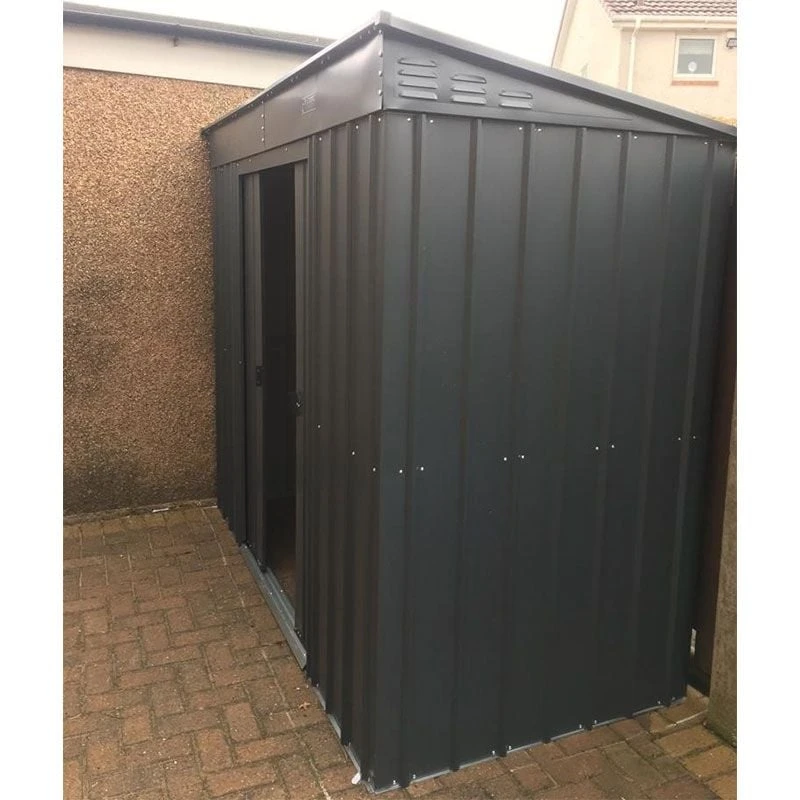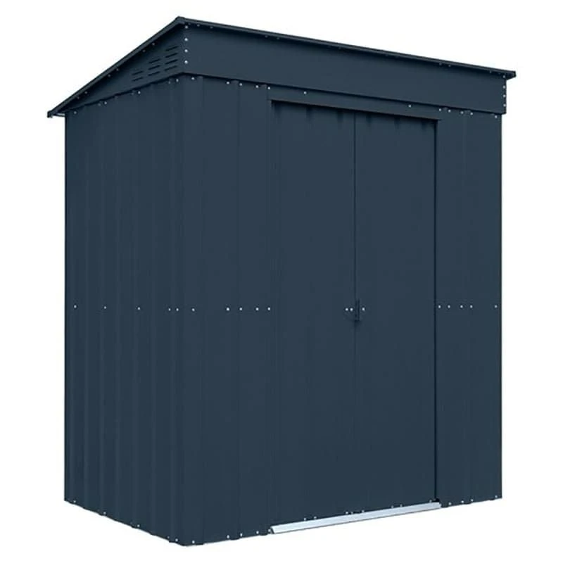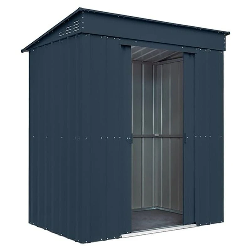 In modern grey, this striking shed is sure to complement your garden. This pent roof shed has higher eaves than most to provide extra headroom for you and more storage space for your garden equipment. Ventilated gables combat condensation and improve airflow. Even the door and track are designed for strength and simplicity. This shed is also perfect for caravan parks where non-combustible storage sheds are compulsory.