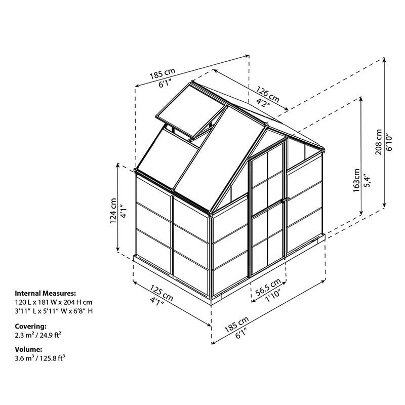 Utilising the very latest Fine Shield Technologyâ„¢, this 6×4 greenhouse is expertly constructed from 4mm twin-wall polycarbonate roof panels and 0.7mm crystal-clear polycarbonate side panels, supported by a rust-resistant aluminium frame and galvanised steel perimeter base.