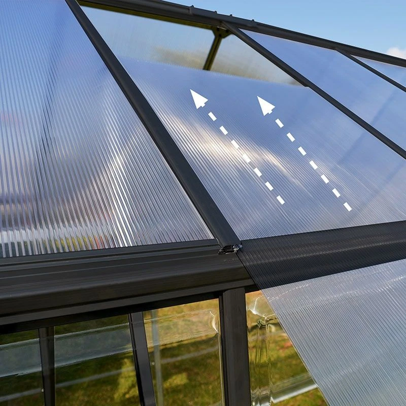 The light-diffusing roof panels promote an even temperature by increasing thermal insulation and reducing extreme sunlight exposure. Both roof and side panels are completely UV-protected and shatterproof, and together they allow 82% light transmission. This means your plants will enjoy optimum growing conditions, you will be protected from harmful UV rays, and the panels will neither discolour nor fade in the sun.