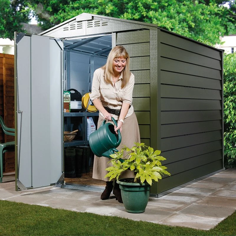This maintenance-free metal shed boasts both beauty and brawn. Olive green in colour, it is sure to complement the rest of your garden; made from PVC-coated galvanised metal, you can rest assured that it is tough and will remain rust free.