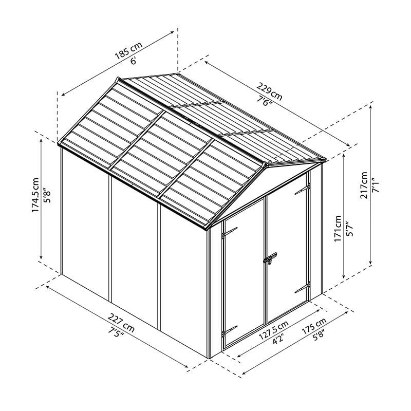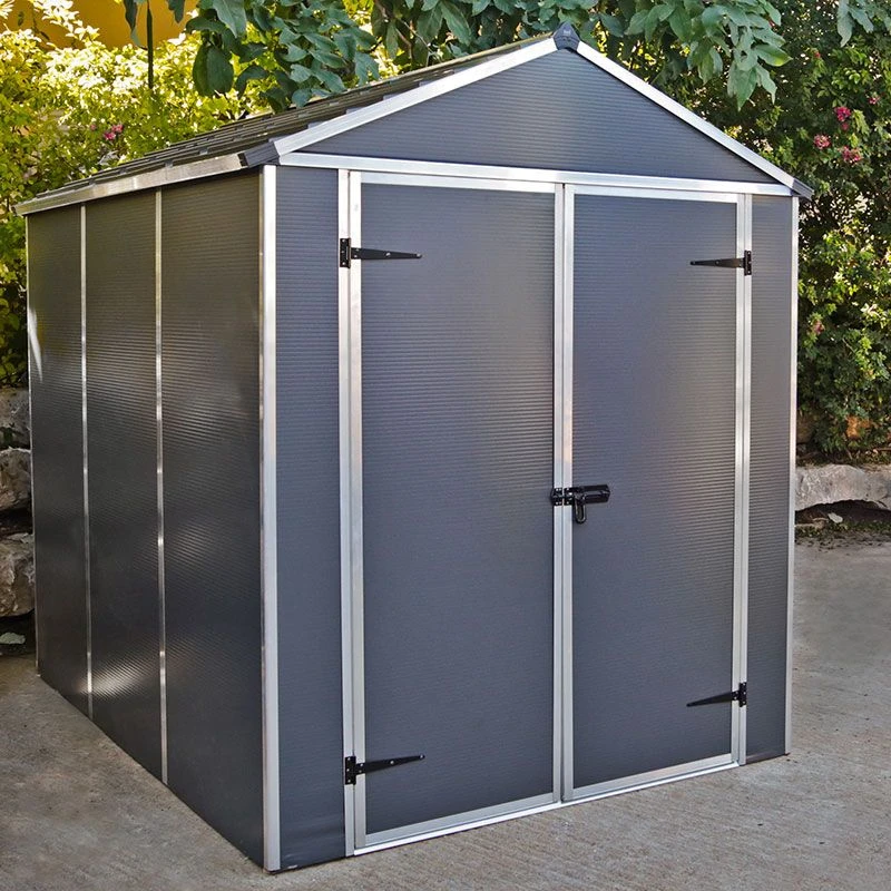 For durable, versatile, maintenance-free outdoor storage, with a superb 12-year guarantee, choose the Palram Canopia Rubicon 6×8 Double Door Plastic Garden Shed in modern dark grey.