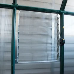 This 6×8 greenhouse is expertly built from 4mm twin-wall polycarbonate panels, which provide 82% light transmission, block 100% of harmful UV rays, and will neither discolour nor fade in the sun. They diffuse direct sunlight and provide excellent insulation, ensuring a stable internal temperature to benefit your plants. The heavy-duty, powder-coated aluminium frame and galvanised steel base are equally robust and completely impervious to rust.
