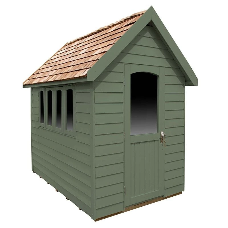 This exquisite 8×5 wooden shed has dimensions of 250cm x 174cm x 257cm. It is also available as a 6×4 shed.