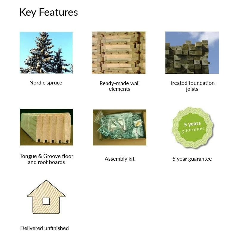 Both the floor and roof are built from 16mm tongue and groove, which is renowned for its weather resistance, durability and strength. Treated foundation joists protect the floor from ground moisture, while the fashionable lean-to roof ensures excellent rainwater runoff.