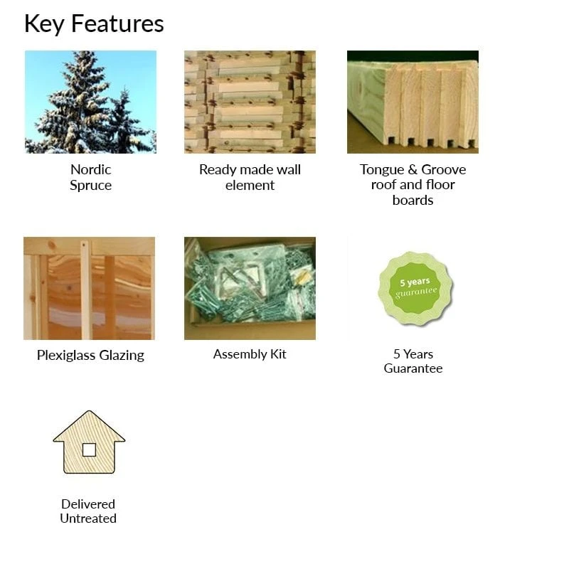 Ready-made wall elements and doors, clear instructions and a complete set of fixings are all supplied to help you achieve a straightforward assembly, even if you’re inexperienced at DIY. All of the parts are covered by a 5 year guarantee.
