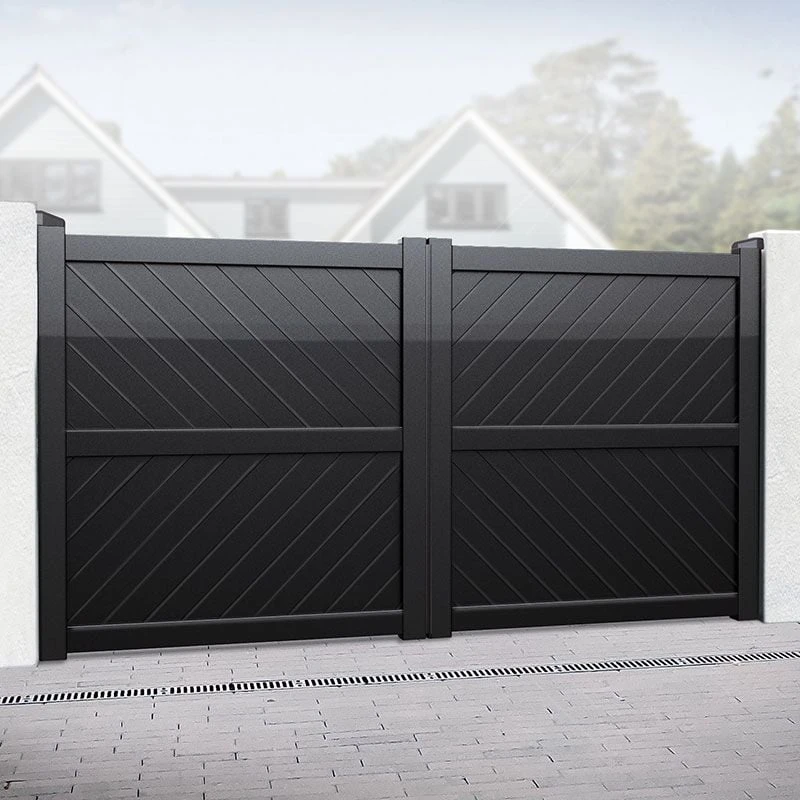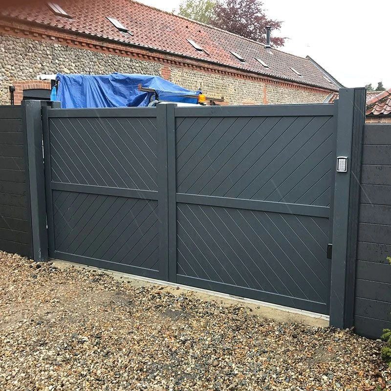 Featuring a solid, diagonal infill and flat top, these double swing gates’ streamlined design oozes class, ensures complete privacy and provides effective security for your property.