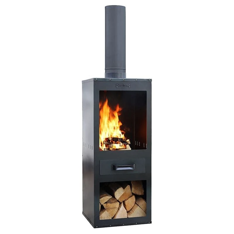 This premium fire pit features a partially-enclosed design to keep your burning wood securely in the stove, while the smoke is released through the chimney. A handy log store, located below the stove, ensures you won’t run out of firewood in a hurry.