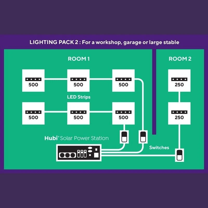 You can choose from 3 separate solar lighting packs, all of which can be mixed and matched with any of the 3 Premium Hubi Solar Power Stations. You should choose Power Station Light Pack 2 if you wish to illuminate a home workshop, garage or stables.