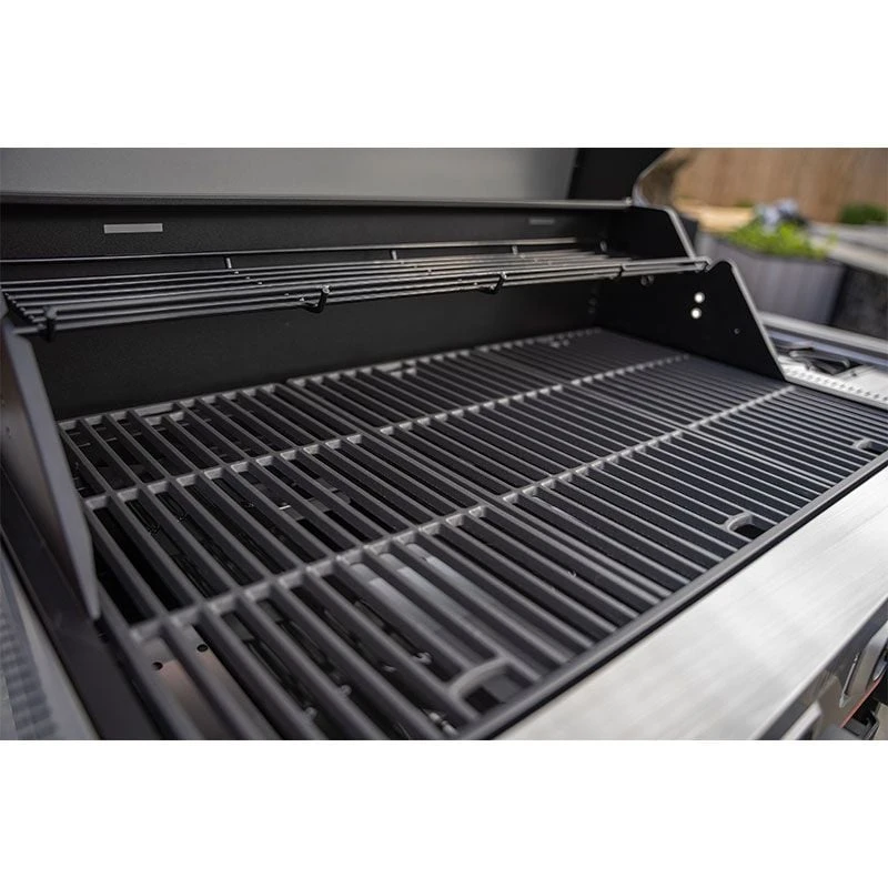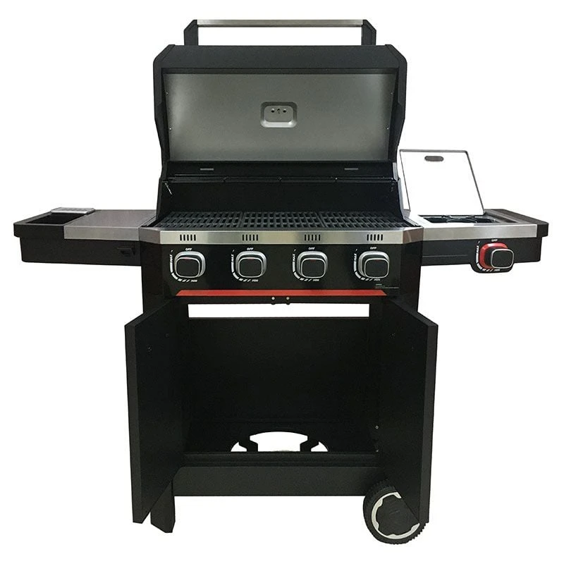 - Features 4 high-powered burners, additional side burner and cast-iron grills