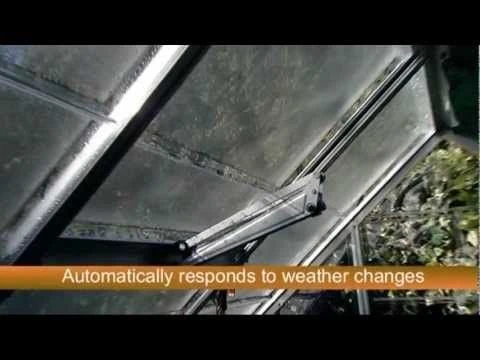 The heat-activated arm is designed using wax, which contracts and expands as the temperature inside the greenhouse changes. The arm begins opening the roof vent at 12-15C, and then closes it as the temperature falls.