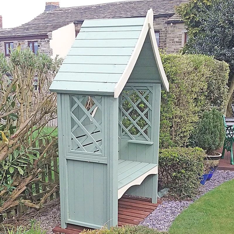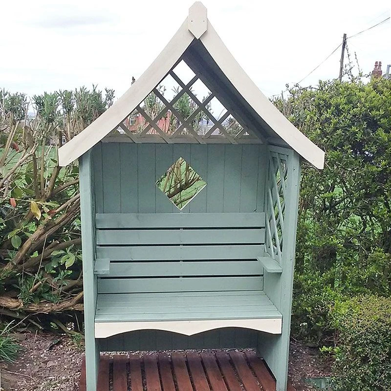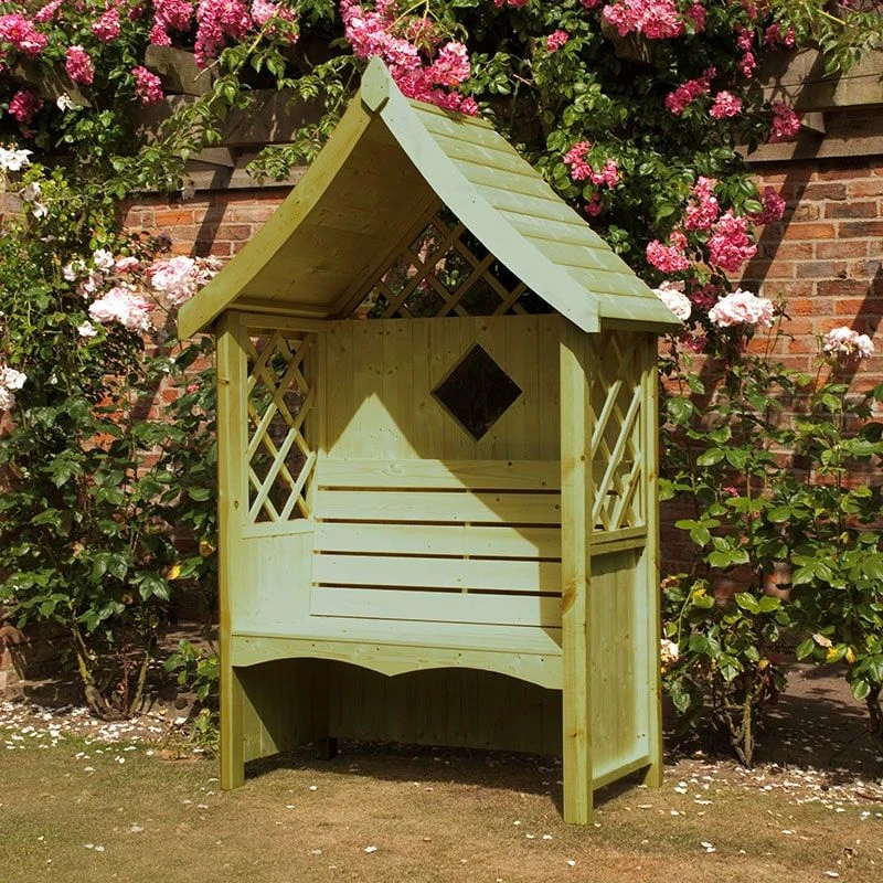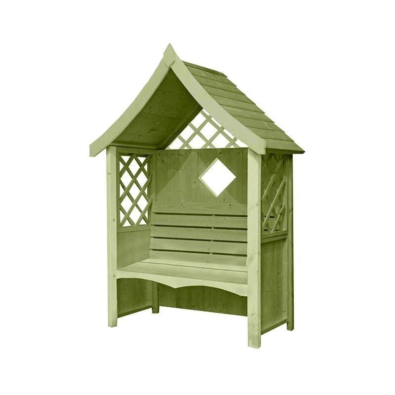 At the heart of this arbour is a thick 34x34mm frame supported by 58x58mm posts. This is topped by a solid 12mm tongue and groove roof and a shiplap tongue and groove back. Add in the decorative trellis sections, the charming diamond cut out and the gently scalloped seat, and you have a wooden arbour that is going to offer you years of beautiful garden seating.